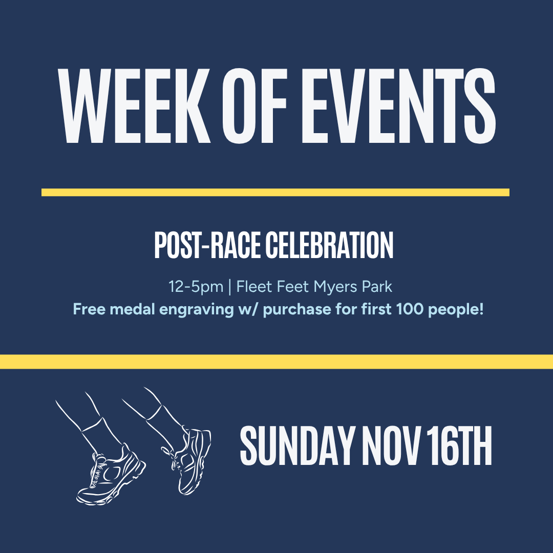 With race day complete, we want to celebrate you and all of your hard work! On Sunday, November 16th, from 12pm to 5pm at Fleet Feet Myers Park, we will have numerous community partners here to support your recovery featuring ASE Pure Naturals and Resilience Chiropractic & Performance. We will also have food and we are so excited to offer medal engraving! If you are one of the first 100 customers in the store on Sunday, you will receive *FREE* medal engraving. So, bring your medal in, recover and celebrate with your friends at Fleet Feet Myers Park! See you there!